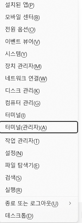 windows 버튼 + x 클릭 > 터미널(관리자) 선택 > 아래 명령어 입력 후 Enter 실행