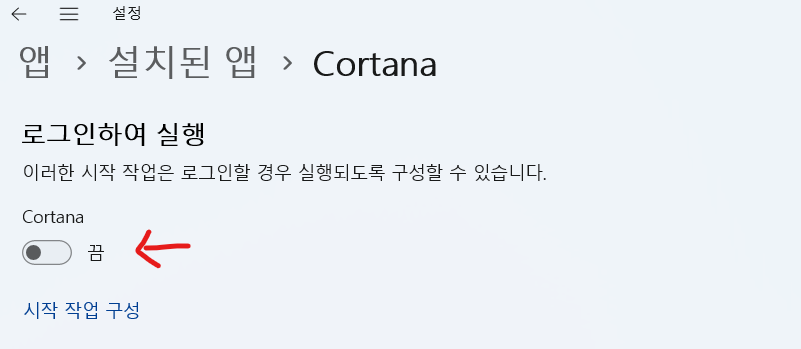 시작 > 검색창 > cortana 검색 > 앱 설정 클릭 > 로그인하여 실행 부분 "끔"으로 설정 변경하기 > 재부팅!